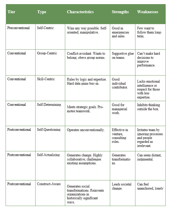 The first tier, Preconventional, contains one stage of development: Self-Centric. We won’t spend much time in this stage, as it contains less than five percent of adults, but it is worth learning the traits so we can recognize them.